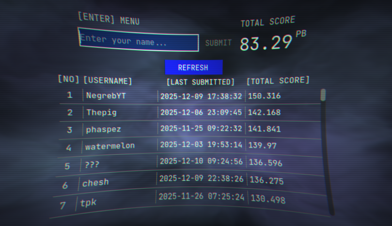 You guys found creative new ways to break the leaderboard, so some simple validations have been added. Your username must be at least 3 characters with more than zero score to be able to submit. It is also capped at 200 entries (it was unlimited before ...plz don't DDoS my game im too poor to pay for the server that host the leaderboard lol)