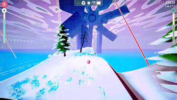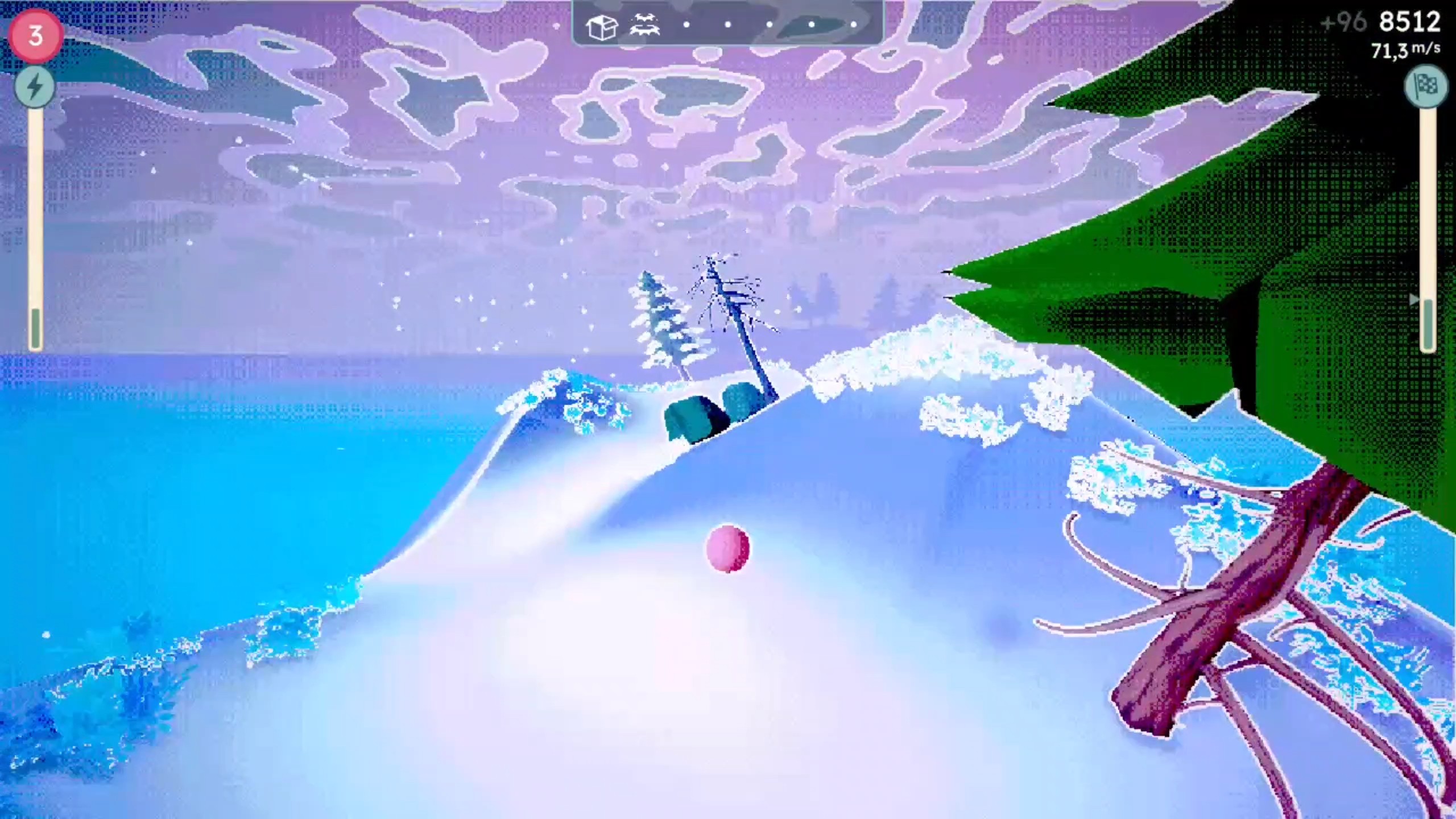 Slide across procedural terrains, use hills to build up speed, create ground slams to destroy enemies, charge power-ups, and avoid death. The path is filled with hazards, and the void moves faster over time, which is indicated by the dark arrow on the map progress. Enter the cyan portal at the end of each level segment to advance.